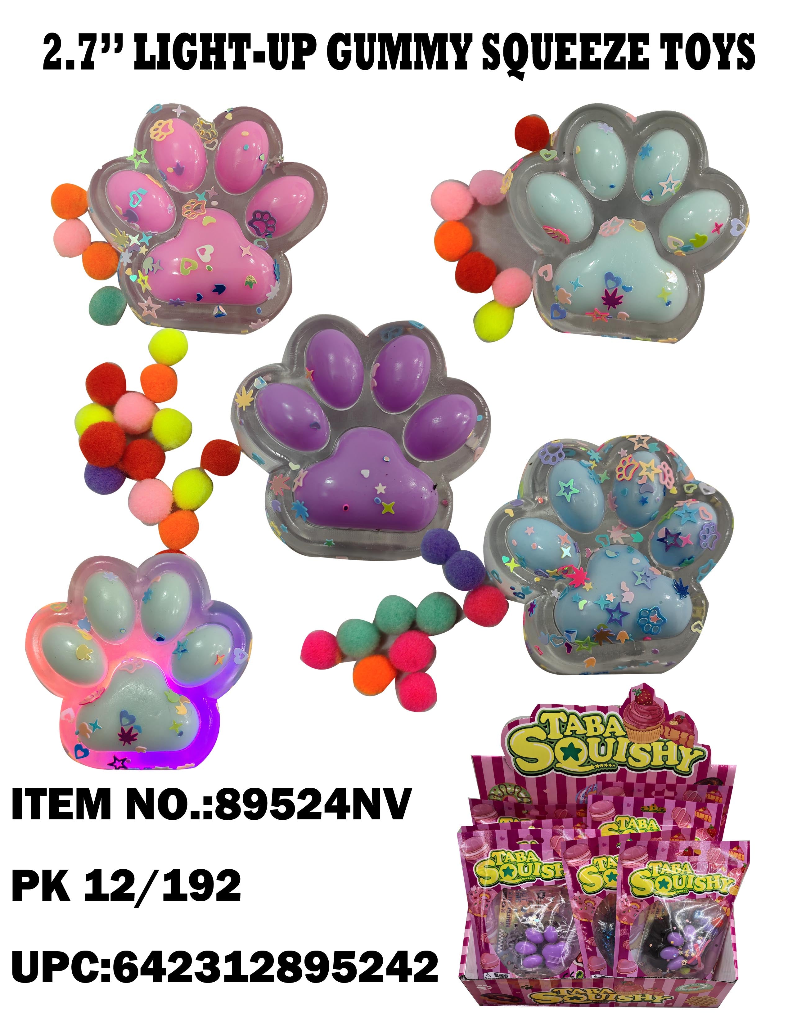 89524 Light Up Squeeze Gummy Cat Paw 12/192PC Assorted Colors Mixed